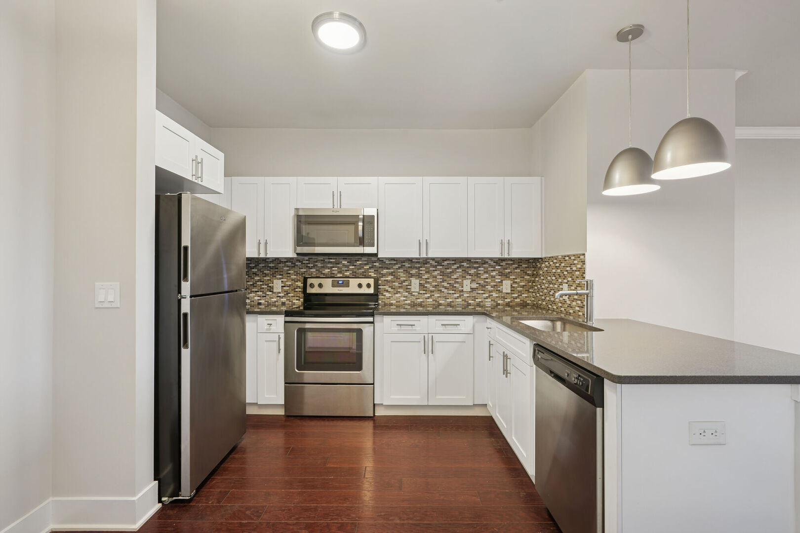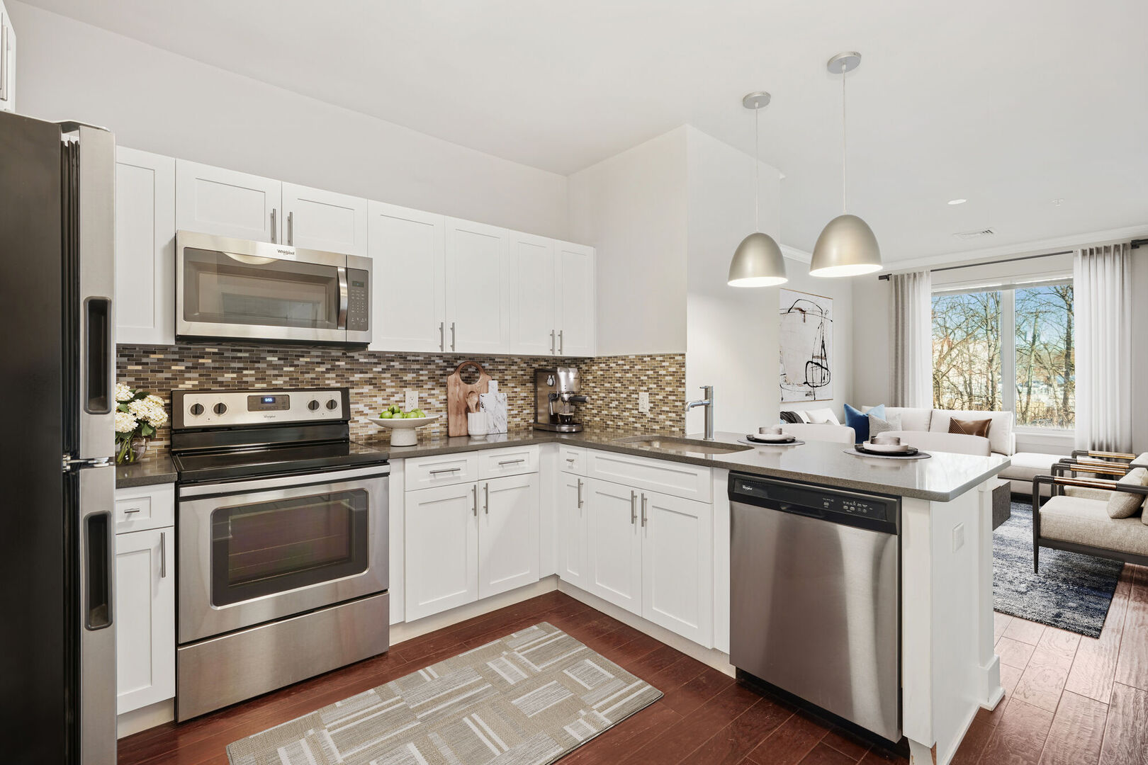 like sleek stainless-steel appliances, stunning quartz countertops and expansive